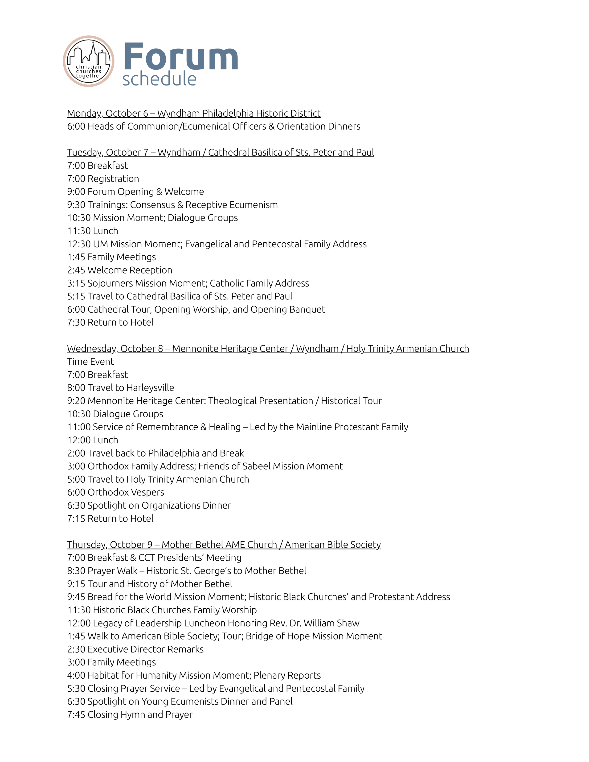 On October 7-9, 2025, leaders from CCT’s 36 communions and organizations will meet in Philadelphia, Pennsylvania to share faith stories, pray in the traditions of CCT’s five families, and reflect on the gospel and the church’s witness. The gathering will explore the ecumenical confession of Jesus as “Light” and a renewed commitment to being a light in the world as we mark the 1700th anniversary of the Council of Nicaea. Additionally, the 500th anniversary of Anabaptism will offer an opportunity to acknowledge historical wounds of dissent and injustice, while reaffirming a shared call to repentance, reconciliation, and the flourishing of all.