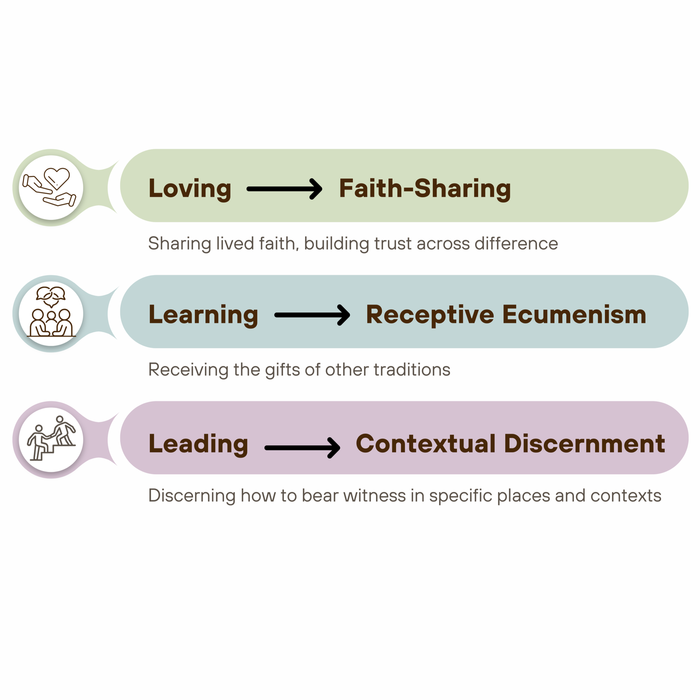 CCT’s life is shaped by three practices: faith-sharing, Receptive Ecumenism, and contextual discernment. Participants share their lived faith, receive the gifts of other traditions, and engage local contexts in faithful witness. As relationships deepen in Christ, differences are better understood, commonalities are affirmed, and trust is strengthened.